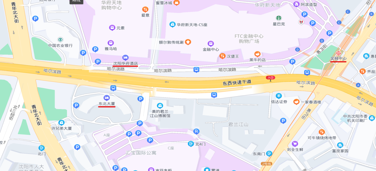 沈阳东北大厦与沈阳华府酒店直线距离70米,两家酒店之间步行约3分钟,从机场、火车站的到达路线基本相同。