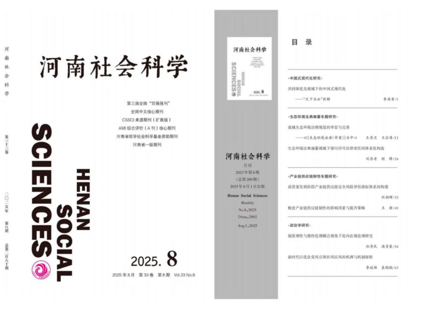 近日,我院刘佳奇教授、胡锋博士师生合作论文“生态环境法典编纂视域下排污许可法律责任的体系化构造”在《河南社会科学》2025年第8期刊发。《河南社会科学》系CSSCI扩展版期刊、北大核心期刊。